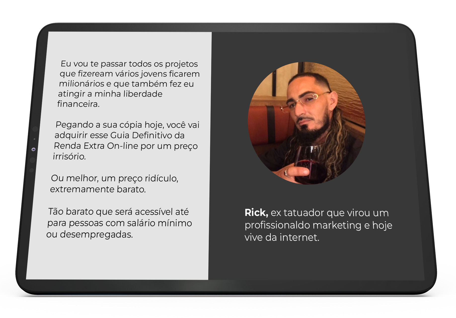 Esse material é para quem está cansado de dinheiro fácil na internet… Cansado de produtos que “comem investimentos”... Cansado de planos absurdos… Foi feito para pessoas ambiciosas, mas que sejam racionais e, minimamente, dispostas a dedicar uma pequena parte do seu tempo para aplicar.